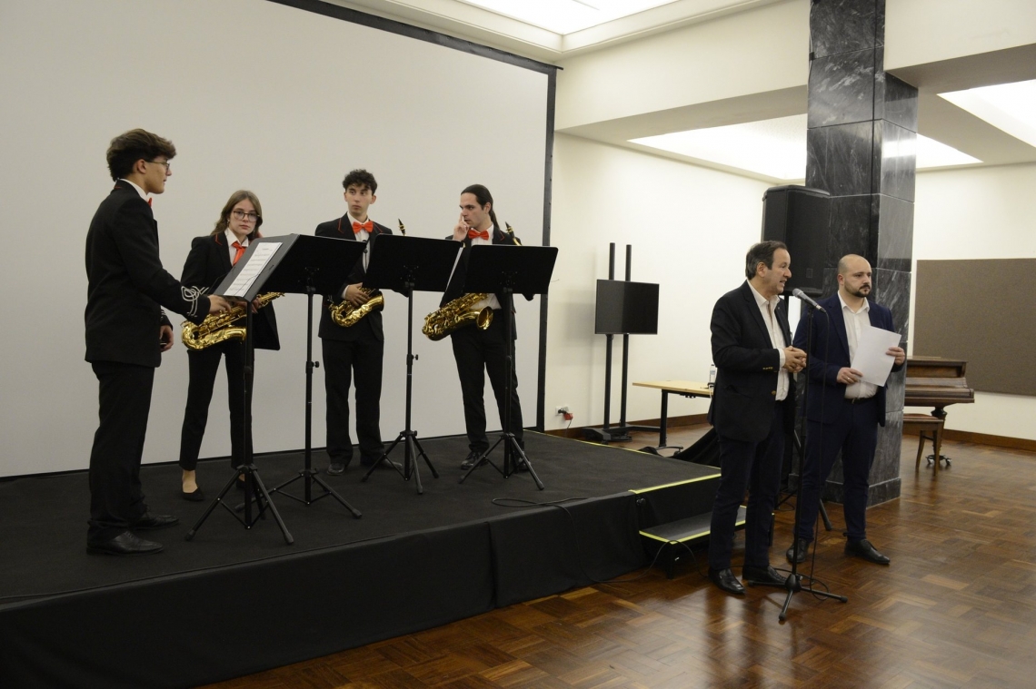 visão por detrás do Concerto de Gala. Este formato permitiu ao público conhecer os bastidores e os detalhes artísticos que tornam os espetáculos da Banda da Covilhã tão especiais. Para complementar a experiência, foi servido vinho branco e tinto, cortesia da Quinta dos Currais, que proporcionou um toque de requinte e hospitalidade ao evento.