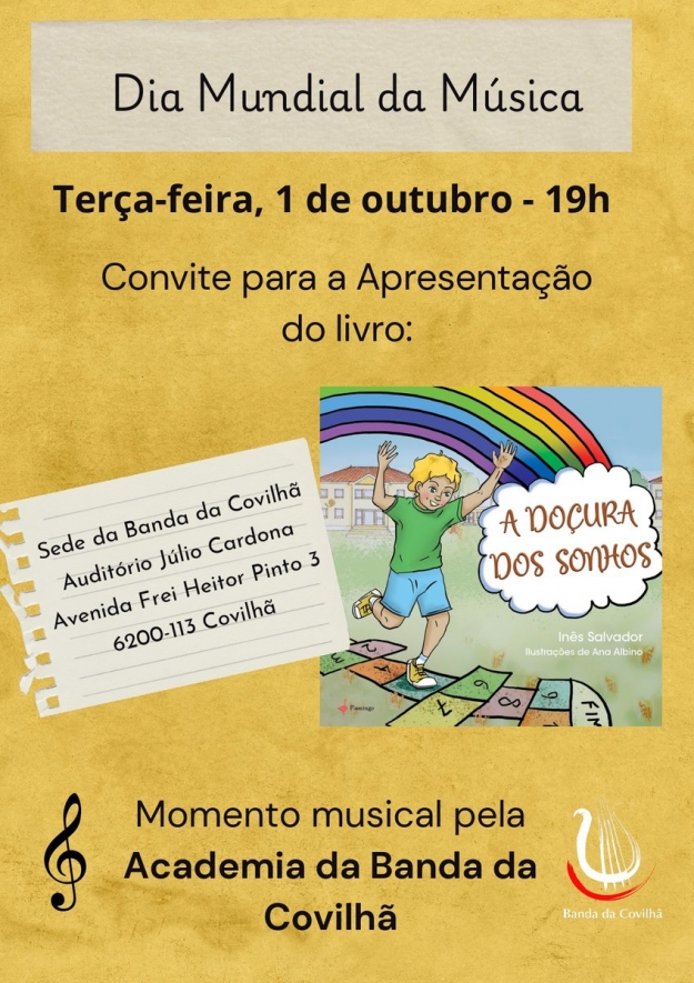 Para assinalar o Dia Mundial da Música que se celebra terça-feira, 1 de outubro, a Banda da Covilhã irá receber Inês Salvador para o lançamento do seu livro infantil “Doçura dos Sonhos”. O evento contará ainda com um momento musical para assinalar este dia e decorre pelas 19:00 horas no Auditório Júlio Cardona da Banda da Covilhã. A entrada é livre, estão todos convidados!