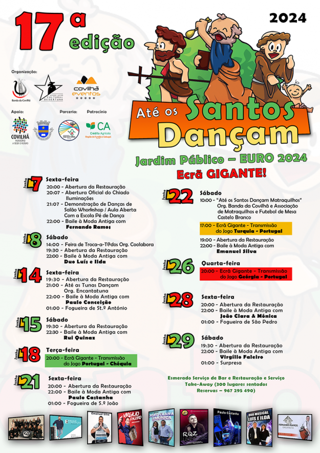 O tradicional arraial popular da Covilhã, Até os Santos Dançam está de volta neste mês do junho no Jardim Público. A tradição da boa sardinha, da broa, do manjerico, das fogueiras de rosmaninho, o chiado, do pé de dança retomam assim ao Jardim Público da cidade. Uma organização da Banda da Covilhã, Associação Cultural Desertuna, Covilhã em Eventos com o apoio do Município da Covilhã.