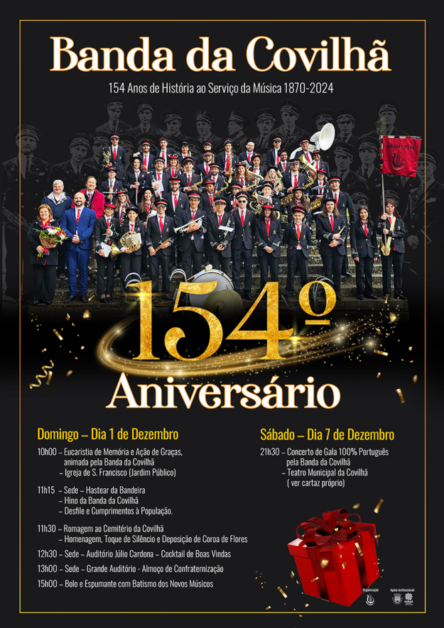 A Banda da Covilhã comemora este ano o seu 154º aniversário! No domingo, 1 de dezembro, a Banda da Covilhã realizará uma Eucaristia de Memória e Ação de Graças, Hastear da Bandeira, Romagem ao Cemitério e um Almoço de Confraternização e Batismo de Novos Músicos. As comemorações culminam no sábado, 7 de dezembro, com o Concerto de Gala 100% Português no Teatro Municipal da Covilhã.