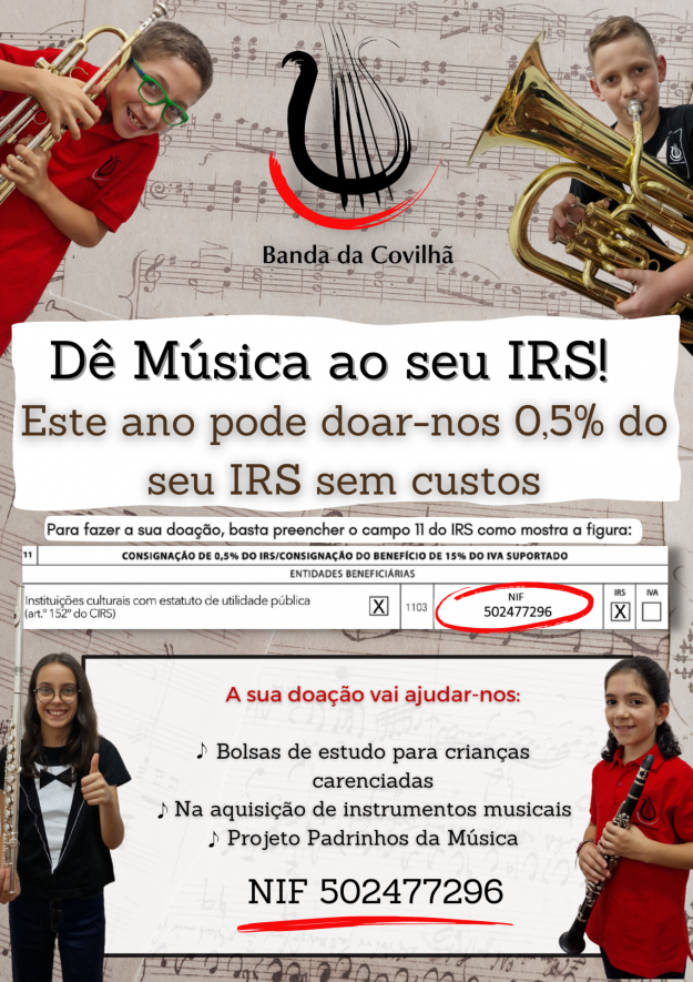 rendimentos Modelo 3 e do IRS Automático. Assim, quando chegar a época declarativa, só tem de confirmar a sua opção, sendo também possível aquando da realização da declaração. Consignar 0,5% do seu IRS não tem qualquer custo associado, uma vez que a verba é retirada do imposto devido ao Estado. Estima-se que 80% dos portugueses não conhecem esta forma de apoiar instituições. O reembolso não será afetado: ninguém receberá menos nem pagará mais. Por outro lado, irá ajudar a proporcionar bolsas de estudo a crianças carenciadas, na aquisição de instrumentos musicais e no projeto Padrinhos da Música da Banda da Covilhã. Na presente data, a Banda da Covilhã atribuiu 30 bolsas de estudo a crianças carenciadas (escalão 1 e 2 da segurança social), representando um valor global superior a oito mil euros de investimento na formação musical. A realidade é que continuam a chegar todos os dias pedidos de apoio, sendo que já existe lista de espera. Consignar 0.5% do IRS é a forma mais simples de apoiar esta causa social sem custo e que pode fazer as crianças felizes.