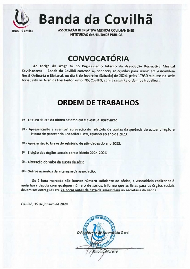 Banda da Covilhã vai a Eleições – Assembleia Geral no dia 3 fevereiro 2024
