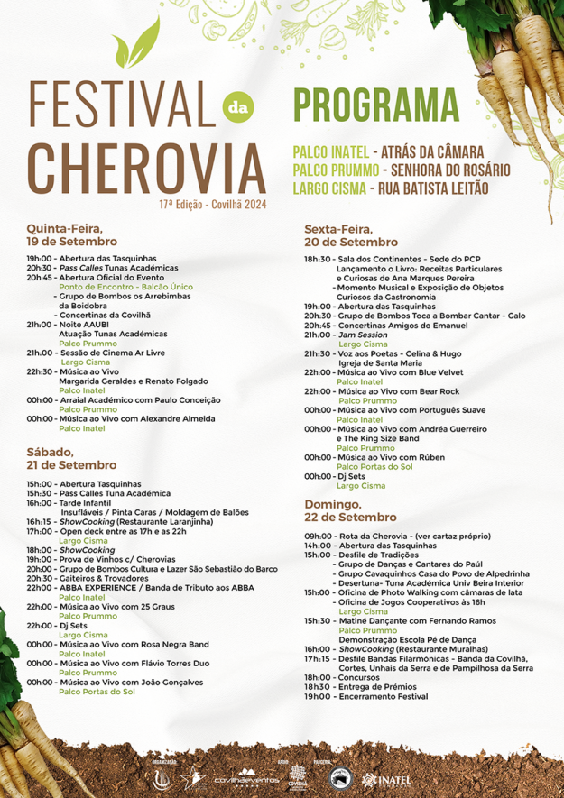 O Festival da Cherovia vai já na sua 17ª edição e arranca na próxima quinta feira, dia 19 de setembro até domingo no centro histórico da bonita cidade da Covilhã. A cherovia, uma raiz que é rainha nas terras da Covilhã vai sair a rua e vestir de várias “roupas” num evento que promete novas ruas, mais stands, mais receitas, mais animação, mais solidário e mais amigo do ambiente.